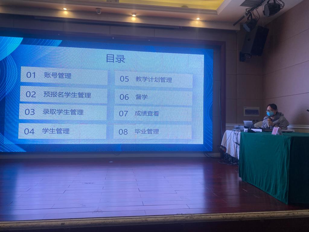 tyc122ccvip相关工作人员分别就继续教育教学管理、考试管理和学籍管理进行了培训,北京超星公司代表就tyc122ccvip高等学历继续教育一体化综合服务平台的操作和使用做了专题培训。