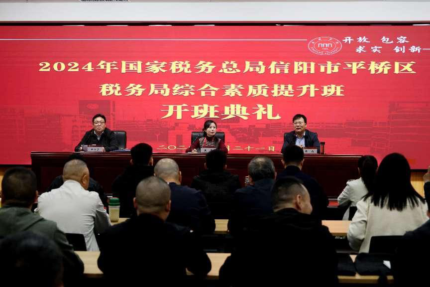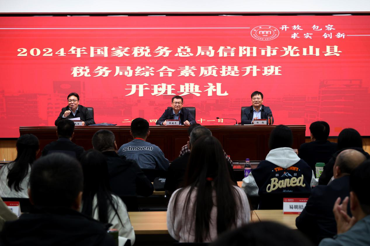 为深入学习贯彻习近平新时代中国特色社会主义思想和党的二十届三中全会会议精神,推进信阳市税务工作高质量发展,10月21日下午,国家税务总局光山县、平桥区税务局综合素质提升班在公司开班。信阳市光山县税务局副局长陈绪平、平桥区税务局副局长张黎、tyc122ccvip副董事长杨钧、tyc122ccvip经理田大治出席开班典礼。此次培训班来自信阳市光山县、平桥区税务局的党员、干部、职工共计130余人参加培训。