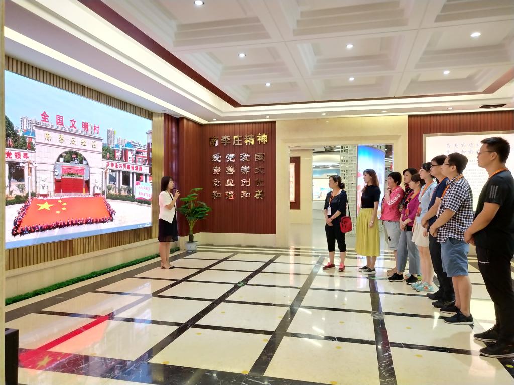 在南李庄村社区展厅,工作人员给大家详细讲解了南李庄从一个贫穷落后的脏乱差村到一个秀美富裕的现代化村的巨大变化,以及村党支部带头人、全国劳动模范范海涛心系广大人民群众,敢挑重担,带领全村党员干部群众艰苦奋斗,为改变全村落后面貌。实现村民共同富裕的先进事迹。
