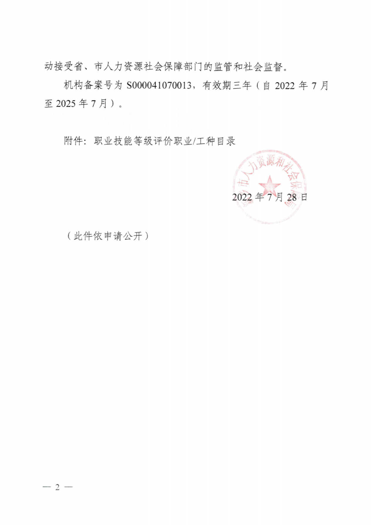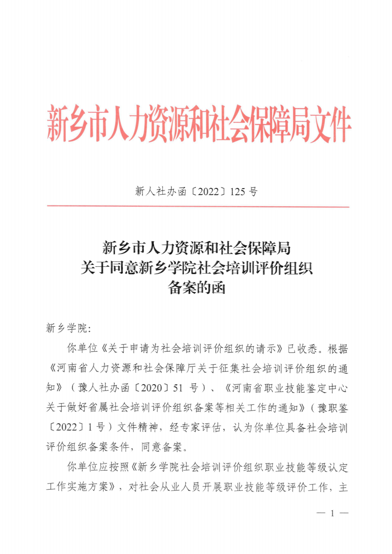 近日,新乡市人力资源和社会保障局发布《关于同意tyc122ccvip社会培训评价组织备案的函》(新人社办函〔2022〕125号),同意公司成为社会培训评价组织备案单位,备案号为:S000041070013,有效期3年。自此,公司已顺利完成河南省人社厅社会培训评价组织备案,可面向社会先期开展电工、制图员、工程测量员、物业管理员、人力资源管理师等5个职业工种相应级别的技能等级的评价认定工作。